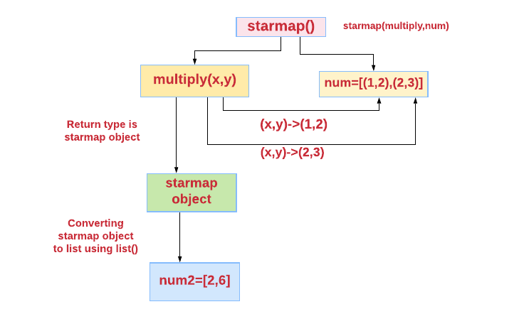multiply(x,y)function will take the first argumentxfrom the first iterablenum1and the second argumentyfrom second iterablenum2.