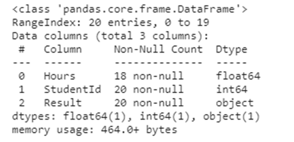 Only the Hours column has 2 missing data. We can drop that rows. If our dataset has many columns means, we can’t drop the rows. We may in need of data from other columns, in that scenario we can replace the missing values by mean.