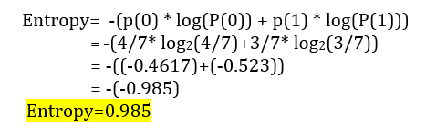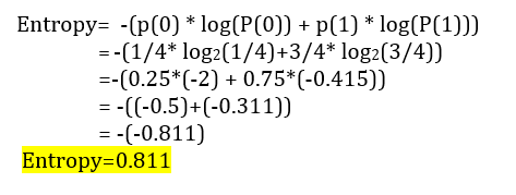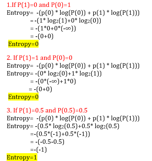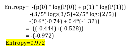 Entropy = -(p(0) * log(P(0)) + p(1) * log(P(1)))