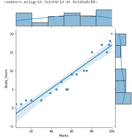 Both “Marks” and “Study_hours” variables have a linear relationship. Shade distribution around the regression line indicates the data distribution.