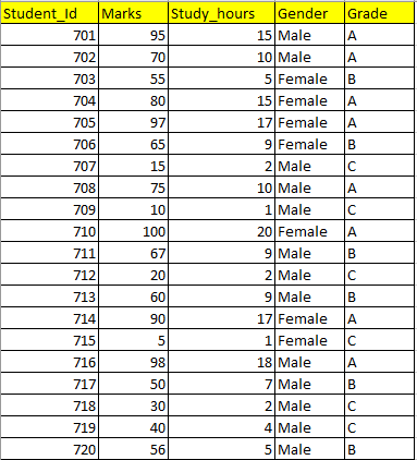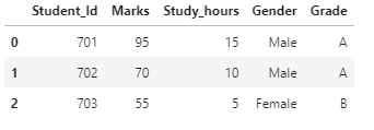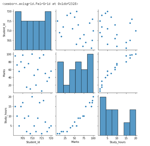 Student_Id column is not showing any relationship with the “Marks” and also the “Study_hours” variable.