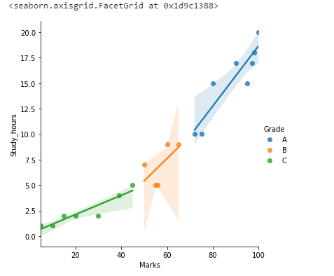 sns.lmplot(x=”Marks”,y=”Study_hours”,data=df,hue=”Grade”)
