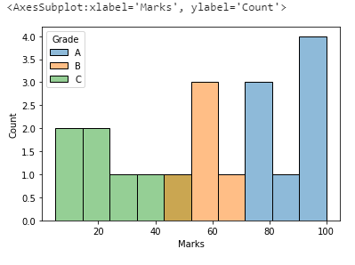 Now, after adding the hue parameter, we get more information like which range of marks belongs to which grade.
