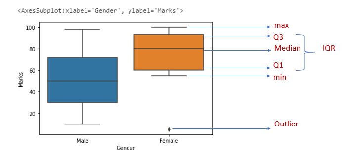 sns.boxplot(x=”Gender”,y=”Marks”,data=df)