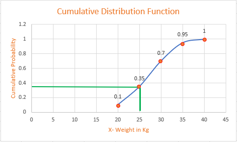 Now, from the graph, we can find P(X≤25). The probability of the weight of students less than 25 is 0.35