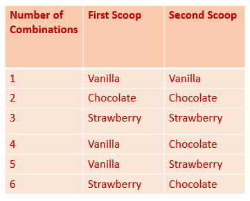 Example: Three flavors of ice-cream are available in that shop. (vanilla,chocolate,strawberry). One person can have only two scoops of ice_cream. What are the different combinations available?