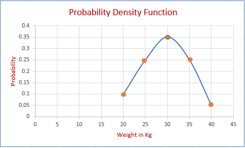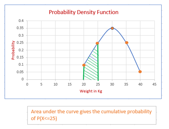 Now, we have to find the probability of weight of students in class less than 25 P(X≤25). In the Probability density function, the area under the curve gives the probability value.
