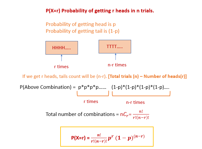- First, we will calculate the total number of combinations of getting r heads in n trials.
