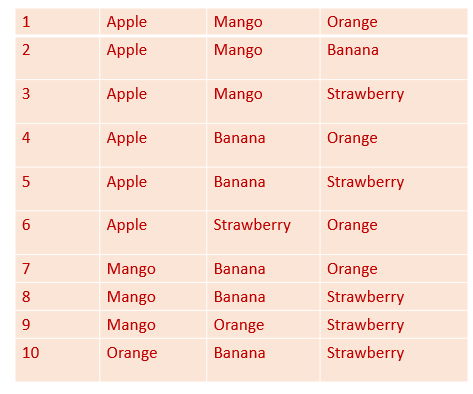 Example: Choosing 3 different fruits from the basket containing 5 different fruits [Order does not matter and repetition not allowed]