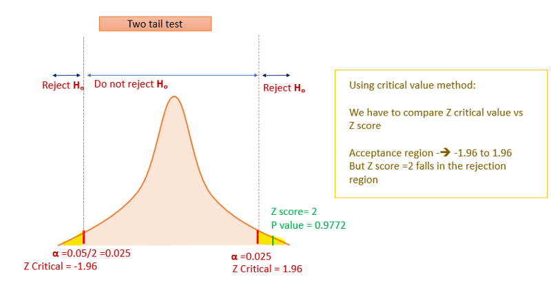 d) two-tail test → 2(p) vs alpha value [ if the sample is on the left side of distribution mean) - Critical value approach