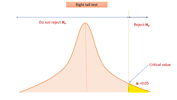 - If the alternative hypothesis has a greater than sign, it’s an upper tail /right tail test.