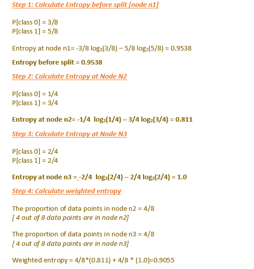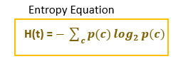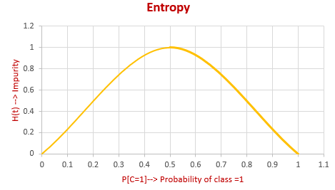 - If the node contains an equal number of data points belong to class 0 and class 1, then p[c=1]=0.5. Entropy will be 1.
