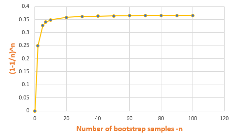 We know that in every bootstrap sample, approximately one-third of data points are left out(36.8%). Approximately only two-third of the original data points from the training set are included in the bootstrap samples(63.2%)