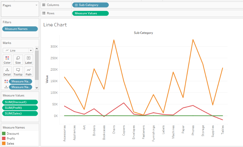 Sales in different sub_Categories → In the below graph, I have chosen line and circle for the same measure [Sales].