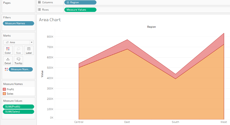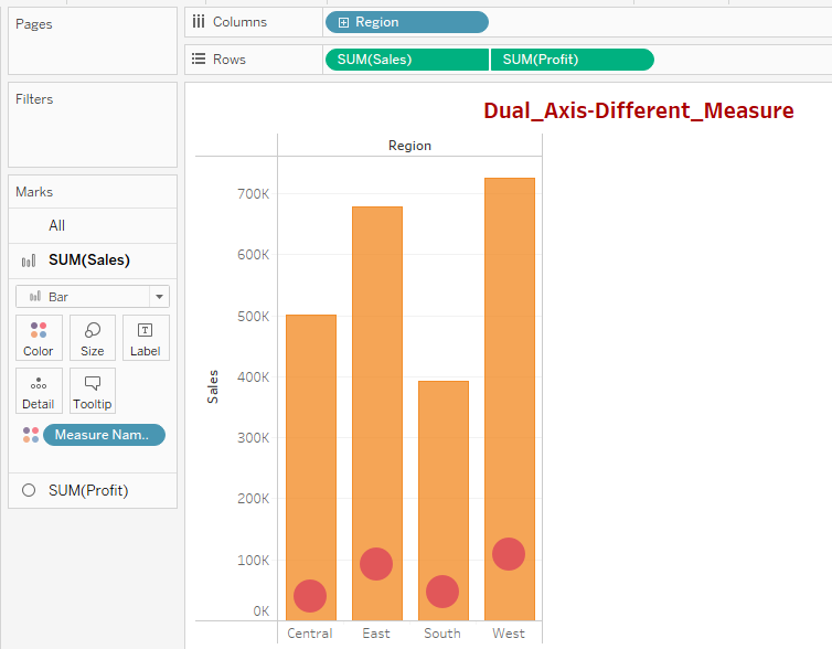 - Drag Region in Column shelf and Sales in Row shelf.Drag Profit to another side of the axis.